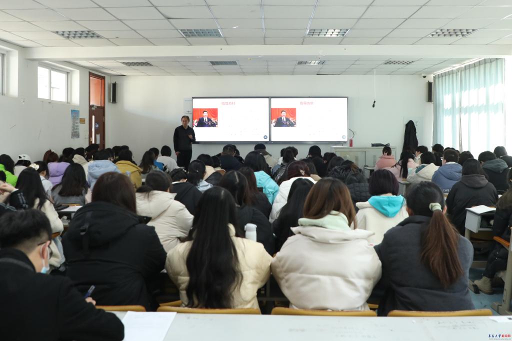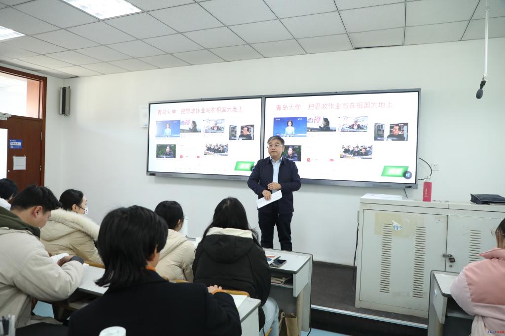 在课间休息时间,胡金焱与任课老师和同学们亲切交流。他充分肯定了近年来学校思政教育取得的成果和进步,并指出“青大思政大课堂”不仅是一个品牌,更是一种教育情怀、育人情怀。以刘正刚教授为总负责人的团队,倾注热忱与情感,充分发挥创新精神和勤劳智慧,引入丰富教学成果和“社会课堂”资源,打造了思政教育的青大样板,形成了可复制可借鉴的亮点品牌。胡金焱对“思政大课堂”建设提出两点建议:一是深入学习习近平总书记对思政课建设的改革创新方法论,以“八个相统一”为指引提高思政课教学质量;二是厚实青大“六大思政”,推进教师思政、课程思政、专业思政、队伍思政、文化思政、学生思政一体化闭环建设,助力推动形成“一二三四五”协同育人格局。最后他鼓励同学们抓住“青大思政大课堂”的学习机会,把思政作业写在祖国大地上。