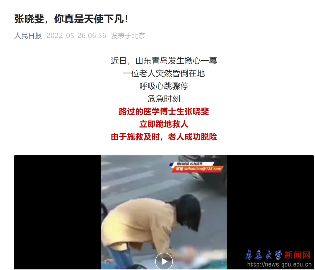 新闻网讯 近日,青岛电视台生活在线节目播出了一段视频,视频中一位女生跪地救助一位倒地昏迷老人,她一直为老人实施急救直至急救车到来。急救现场,她娴熟、专业的急救操作和敬畏生命的职业素质得到了现场民众的高度称赞。经多方了解,图片中这个学生为beat365在线唯一官网医学部2018级消化内科学博士研究生张晓斐。
