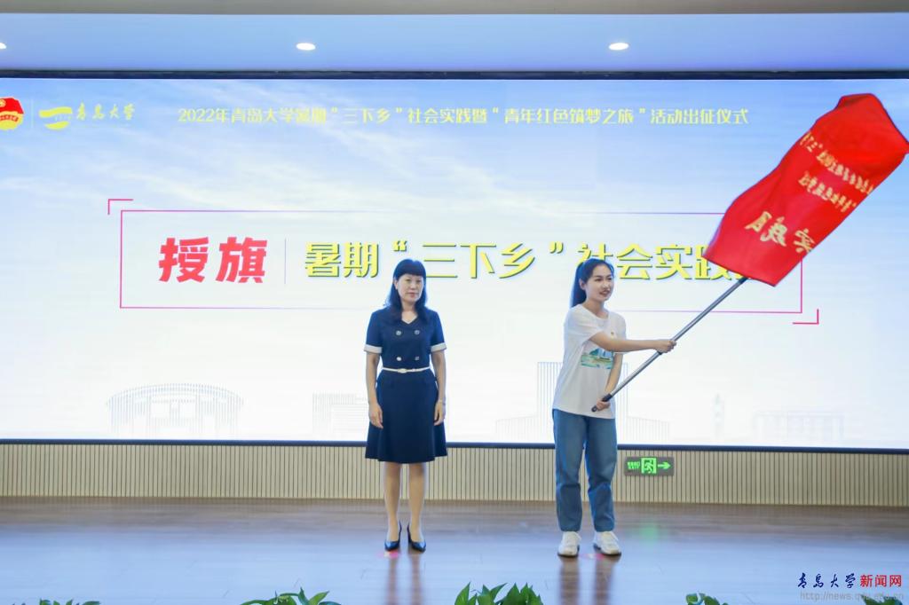 刘彩云为beat3652022年暑期“三下乡”社会实践暨“青年红色筑梦之旅”授总旗。与会领导分别为2022年beat365在线唯一官网社会实践团队代表授旗。