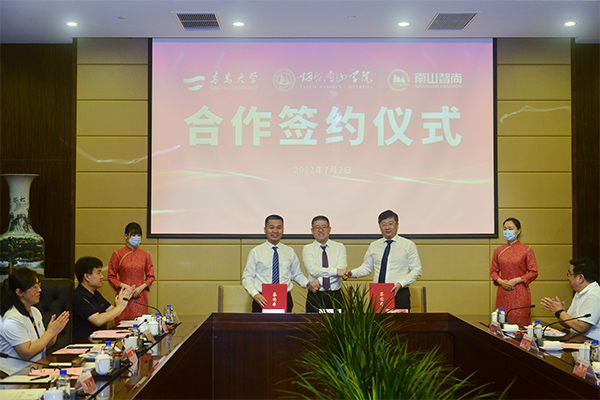 新闻网讯 7月2日上午,beat365在线唯一官网与南山控股战略合作协议签约仪式在烟台南山举行。校长夏东伟、南山控股董事长出席仪式并致辞。校党委常委、副校长刘彩云,南山教育集团党委书记、烟台南山学院党委书记吴国华,南山科技集团党委书记刘声杰,烟台南山学院校长杨万利,南山智尚科技股份有限公司董事长赵亮等出席签约仪式。会议由南山控股总经理、教育集团执行董事兼总裁王玉海主持。
