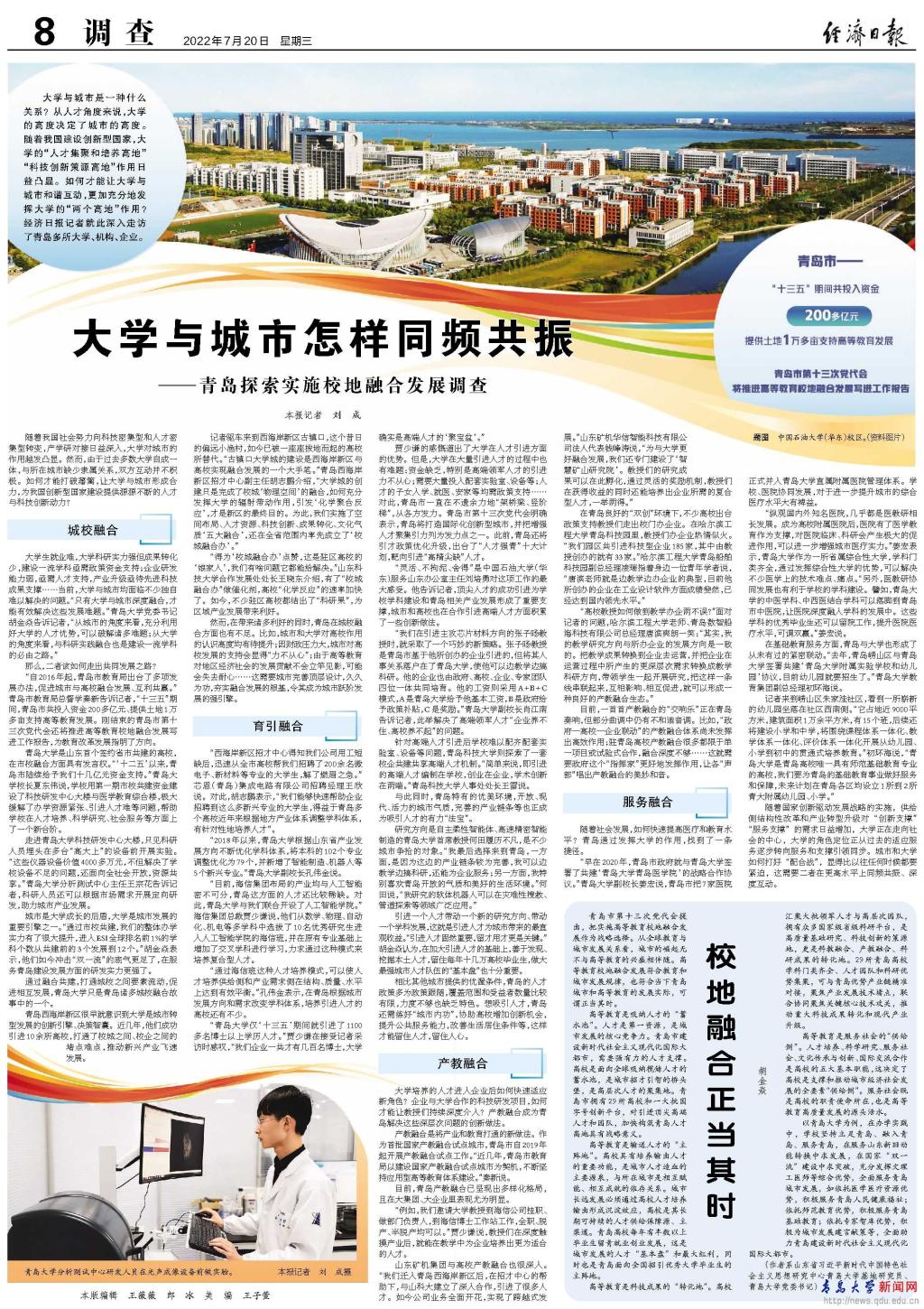 新闻网讯 7月20日,《经济日报》记者刘成发表“大学与城市怎样同频共振——青岛探索实施校地融合发展调查”,以beat365在线唯一官网为例从城校融合、育引融合、产教融合、服务融合四个方面深入分析了大学与城市的关系。