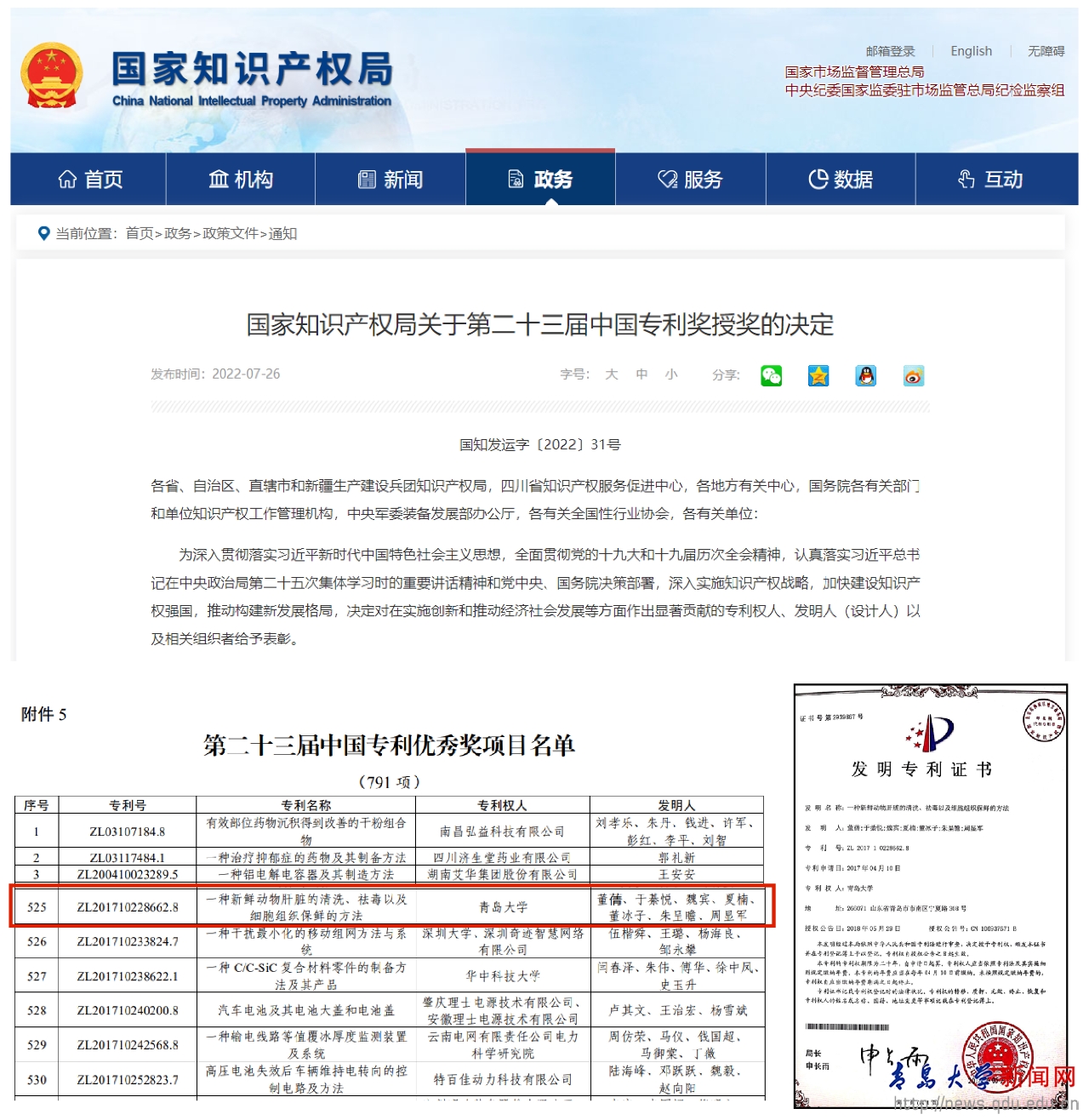 新闻网讯 7月26日,国家知识产权局公布了关于第二十三届中国专利奖授奖的规定,根据《中国专利奖评奖办法》规定,经国务院有关部门知识产权工作管理机构、地方知识产权局、有关全国性行业协会,以及中国科学院院士和中国工程院院士等推荐,中国专利奖评审委员会评审,社会公示,beat365在线唯一官网数字医学与计算机辅助手术研究院研发的青英董氏祛毒猪肝技术:“一种新鲜动物肝脏的清洗、祛毒以及细胞组织保鲜的方法”(专利号:ZL201710228662.8)荣获第二十三届中国专利奖优秀奖!