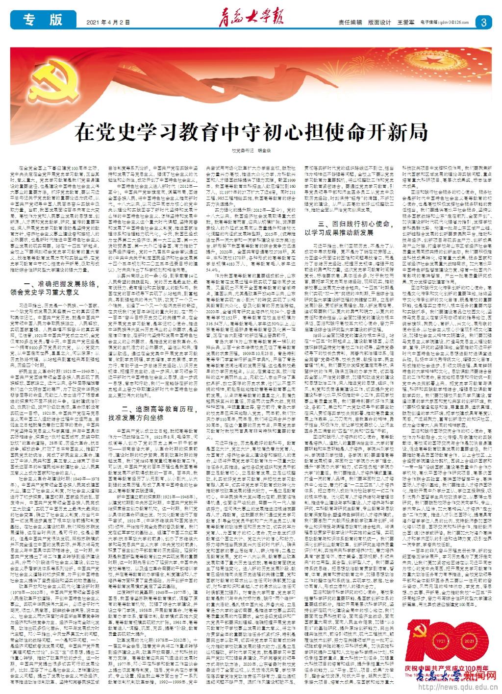 在全党全国上下喜迎建党100周年之际,党中央决定在全党开展党史学习教育,正当其时、意义重大。党史学习教育是我们党自身建设的重要途径,也是建设中国特色社会主义伟大事业的重要方法。抓好党史教育,要以习近平总书记关于党史教育的重要论述为统领,从中国共产党领导中国人民百年奋斗实践中汲取力量。当前,我国发展面临百年未有之大变局,高校作为党和人民事业发展的思想库、创新源、人才泵和党史教学、研究、宣传的重要阵地,深入开展党史学习教育是坚持党的教育方针,培养社会主义事业建设者和接班人的必然要求,也是新时代推进中国特色社会主义事业发展的现实需要。站在“十四五”新起点,全校上下要深刻领会党史学习教育的重大意义,找准高等教育发展方向和实践坐标,在党史学习教育中守初心担使命开新局,汲取形成推动综合性研究型大学建设的强大力量。