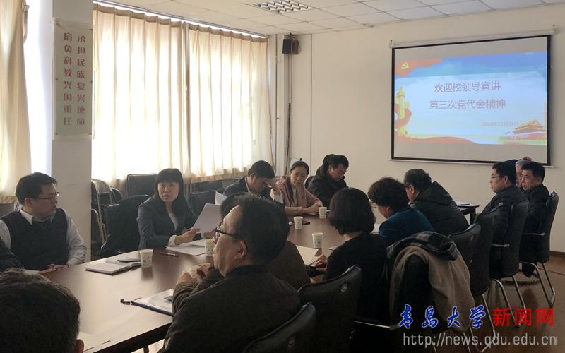 12月18日下午,校党委常委、副校长刘彩云召集学生处、团委、东校区办公室和环境科学与工程学院、化学化工学院、体育学院的中层干部,在浮山校区诚思楼环境科学与工程学院学术报告厅宣讲学校第三次党代会精神。在简要介绍学校第三次党代会筹备过程之后,刘彩云结合国际、国内形势和个人学习体会,对党代会报告中提出的“一三五五十”的工作思路做了重点解读。刘彩云指出,报告全面客观地总结了第二次党代会以来的成绩和经验,全面分析了面临的问题和挑战,明确提出了新时代beat365在线唯一官网的历史使命与办学思路,对建设国内外有较大影响的一流大学这一宏伟目标做出了战略部署,这充分体现了校党委加快“双一流”建设、促进新时代高水平大学发展的信心和决心,也凝聚着全校上下的集体智慧,反映了全校共产党员、广大师生员工和广大校友的共同心声,是学校加快实现走在前列和由大到强转变的行动指南。通过宣讲,大家对未来五年学校的重点任务有了更进一步的了解,对学校面临的形势有了全新的认识,进一步增强了勇担使命、奋发图强、建设新时代高水平大学的信心和力量。