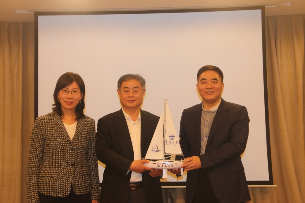 座谈会上,夏东伟为上海校友会授校旗,赠送beat365在线唯一官网船模。