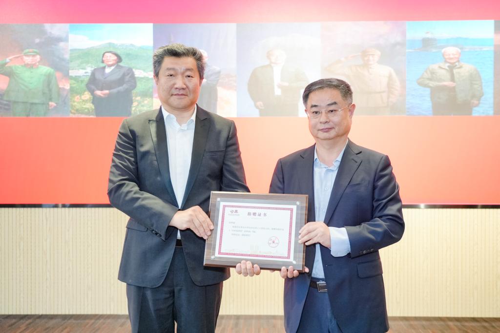 夏东伟代表学校接受山东艺术学院徐青峰教授团队的画作《“共和国勋章”获得者》,并为徐青峰教授颁发捐赠证书。
