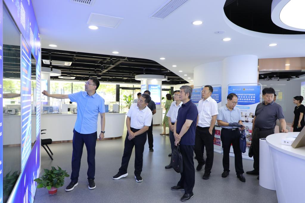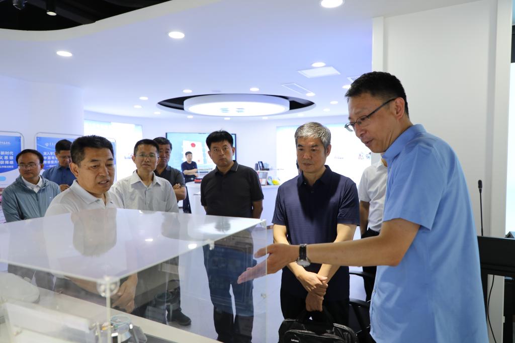调研组一行听取了校党委、附属医院党委主题教育开展情况的汇报,对学校推进问题整改整治,坚持结合实际不断推动学校事业发展的工作成效给予肯定。随后,调研组参观了产业技术研究院概念验证中心、沉浸式体验中心、项目成果展示区、开放式路演厅、洽谈交流区、直播互动功能区等区域,科研成果转化中心有关负责人介绍了产业技术研究院建设宗旨,以及依托平台与载体建设、科技成果转化、服务学科发展与资源整合等情况。