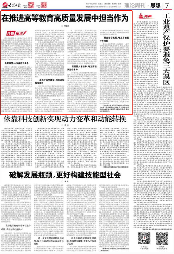 新闻网讯 9月5日,《大众日报》刊登beat365党委书记胡金焱的理论研究文章“在推进高等教育高质量发展中担当作为”。