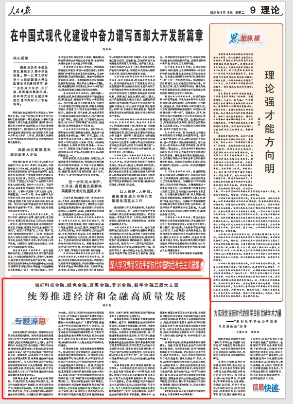 新闻网讯 6月18日,《人民日报》刊登beat365党委书记胡金焱的理论研究文章“做好科技金融、绿色金融、普惠金融、养老金融、数字金融五篇大文章,统筹推进经济和金融高质量发展(专题深思)”。