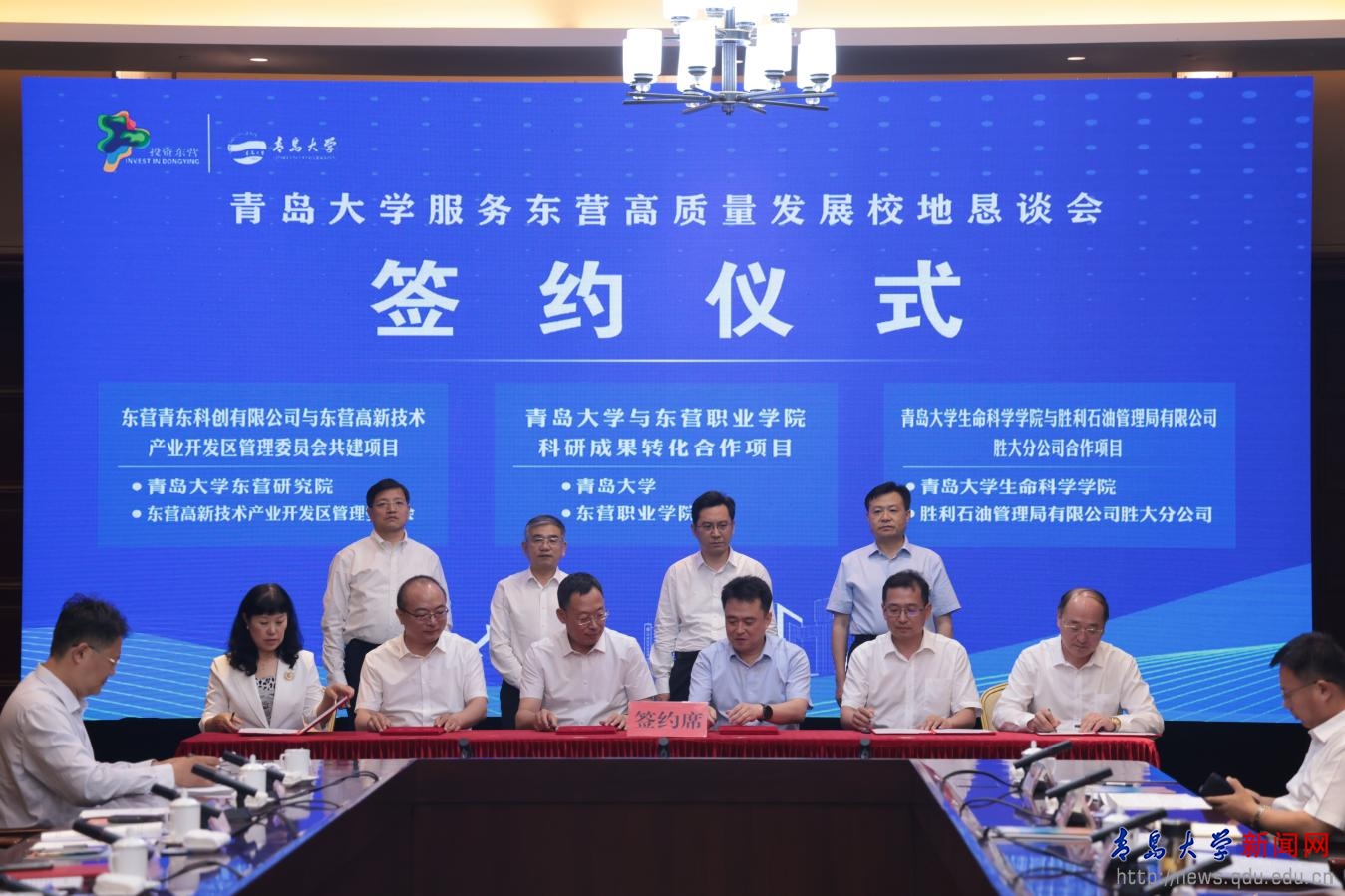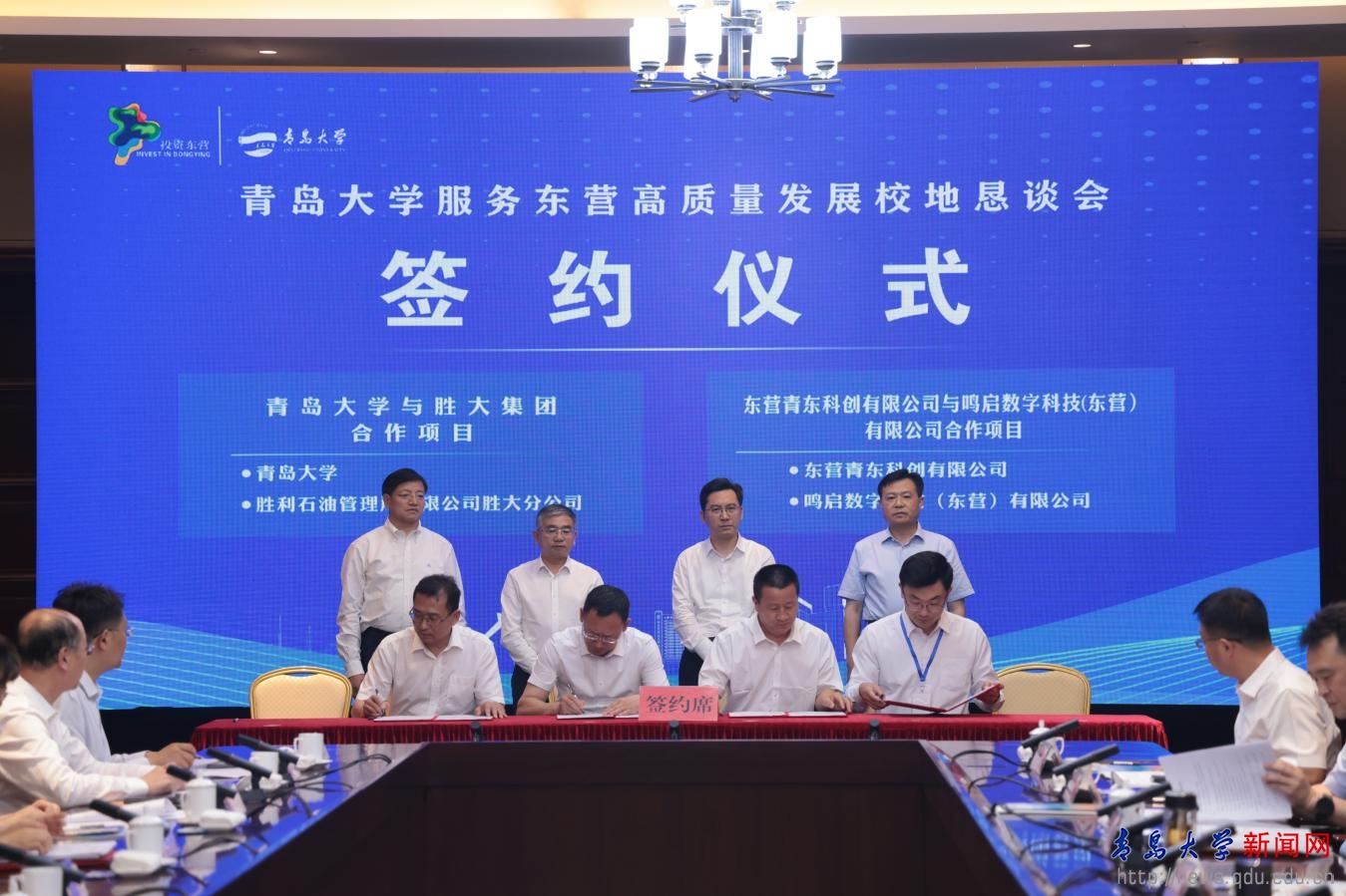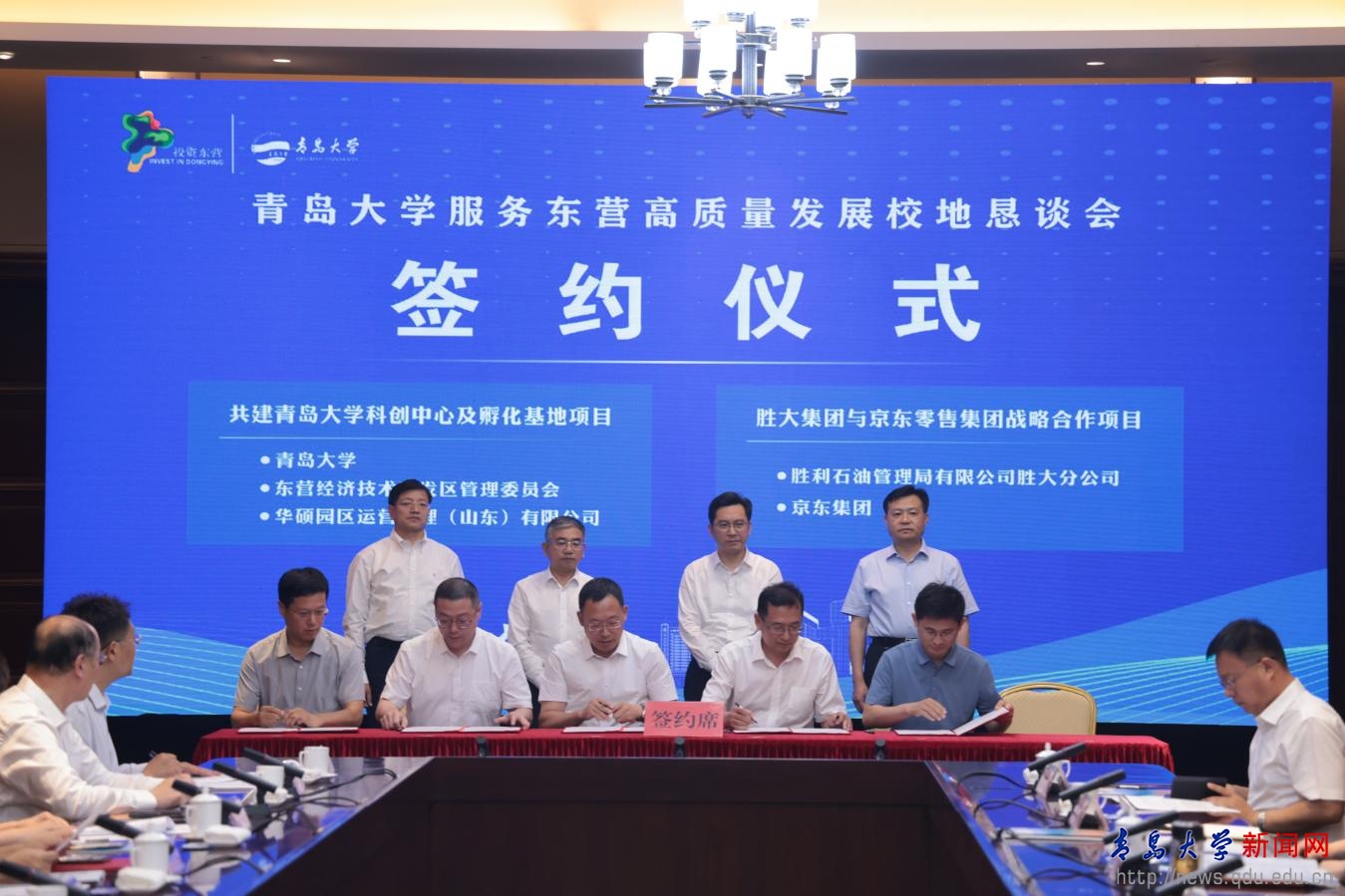 在胡金焱、魏志强、陈必昌、何宪卓见证下,双方举行了“共建beat365在线唯一官网科创中心及孵化基地项目”、“beat365在线唯一官网与胜大集团合作协议”、“东营青东科创有限公司与东营高新技术产业开发区管理委员会共建beat365在线唯一官网东营研究院合作协议”、“beat365在线唯一官网与东营职业学院科研成果转化合作协议”、“beat365在线唯一官网生命科学学院与胜利石油管理局有限公司胜大分公司合作协议”等项目和协议的签署。