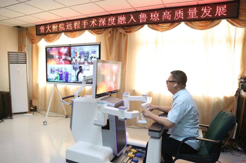胡金焱在现场观摩时指出,机器人远程手术技术是新质生产力的重要体现,不仅是高科技领域智能化与信息化的有效整合,更在优化医疗资源配置、提升治疗效率等方面展现出巨大潜力,有广阔的发展前景。此次远程手术的成功实施,是青大附院优质医疗资源辐射至海南省陵水县的重要举措,既实现了手术资源的直接下沉,又实现了手术过程中的知识迁移,对提升当地医疗水平具有重要意义,树立了远程医疗技术应用的标杆。期待能有更多海南地区的医疗专家掌握这一前沿技术,让优质医疗资源跨越区域界限,实现更加均衡的分布,共同推动区域医疗水平进一步提升,惠及更多群众。