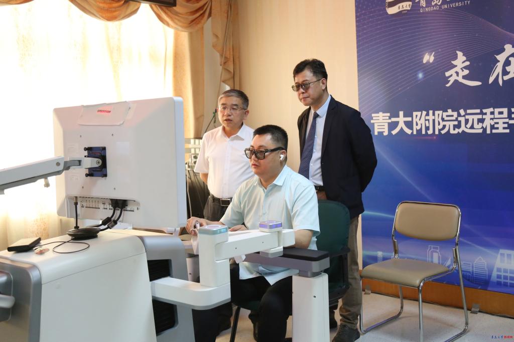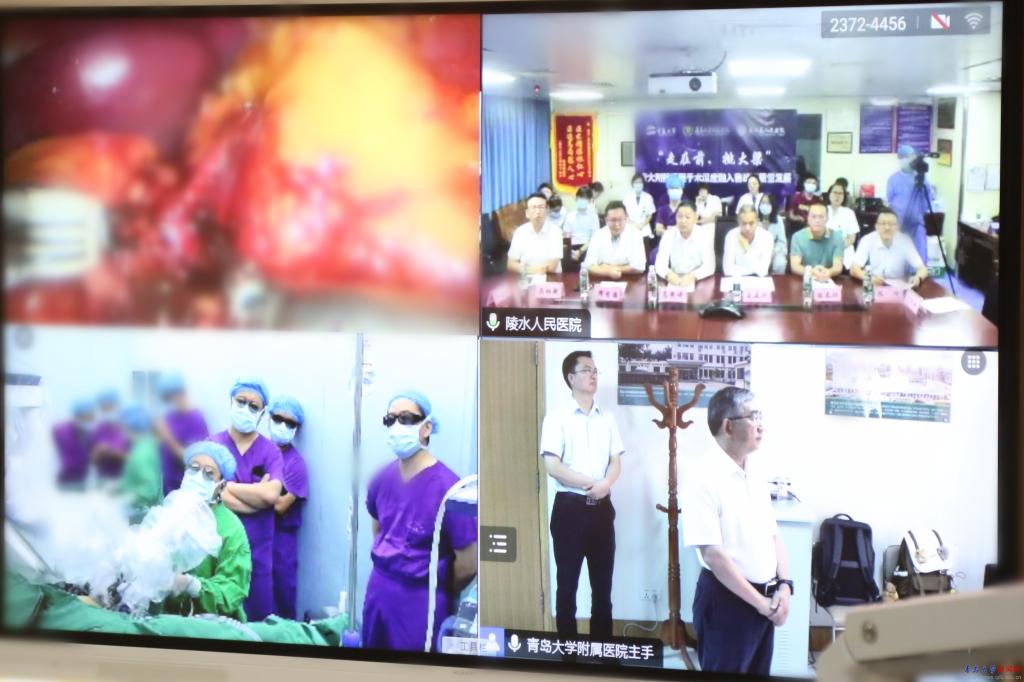 新闻网讯 7月8日,青大附院机器人辅助远程手术在青岛市与海南省陵水黎族自治县之间成功开展。此次远程手术由学校、附属医院及陵水县人民医院等多家单位联合完成,校党委书记胡金焱出席并现场观摩,校党委常委、副校长牛海涛现场指导,海南省卫健委医政处处长、海口市卫生健康委主任高新谱,青大附院院长、青大医疗集团总院长李环廷,陵水黎族自治县县委常委、副县长莫泉平等领导出席手术直播活动,青大附院泌尿外科病区主任杨学成作远程手术操作。