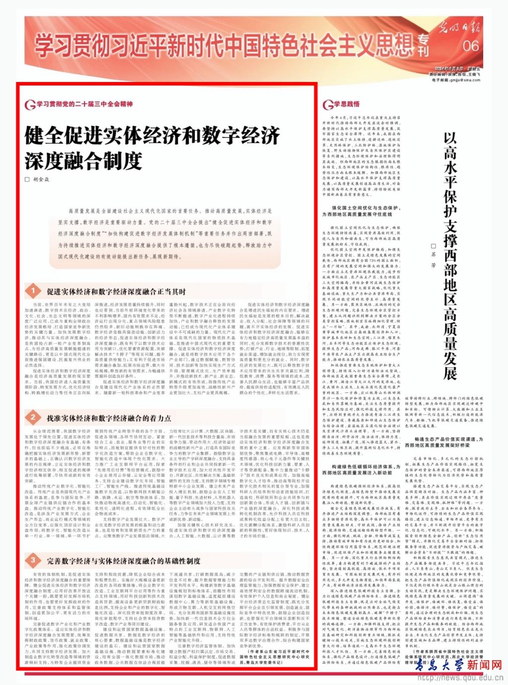 新闻网讯 8月2日,《光明日报》刊登beat365党委书记胡金焱关于“学习贯彻党的二十届三中全会精神”专题文章《健全促进实体经济和数字经济深度融合制度》。