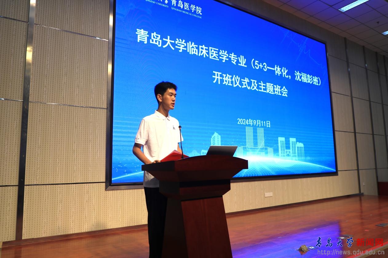 沈福彭班2024级学生王铭辰作为学生代表发言。他讲述了自己立志学医的初衷以及和青医结缘的历程,表达了全体沈福彭班同学传承“青医精神”、立志献身医学的决心,表示要努力做沈福彭式的健康守护者。