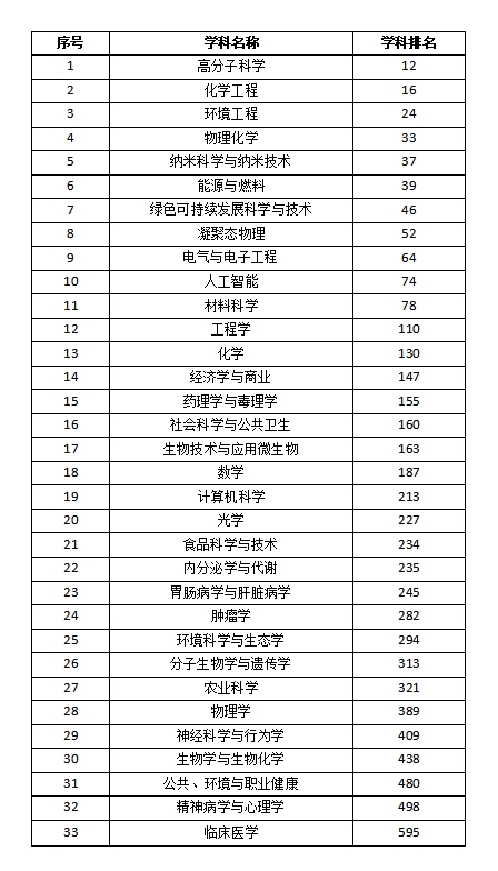 在beat365在线唯一官网33个上榜学科中,较去年新增的学科分别是:经济学与商业,内分泌学与代谢,胃肠病学与肝脏病学,公共、环境与职业健康,精神病学与心理学。有11个学科排名位居全球前100位,分别为高分子科学(第12位)、化学工程(第16位)、环境工程(第24位)、物理化学(第33位)、纳米科学与纳米技术(第37位)、能源与燃料(第39位)、绿色可持续发展科学与技术(第46位)、凝聚态物理(第52位)、电气与电子工程(第64位)、人工智能(第74位)和材料科学(第78位)。另外,工程学等7个学科排名位居全球100-200位,计算机科学等7个学科排名位居全球200-300位,分子生物学与遗传学等8个学科排名位居全球300-600位。