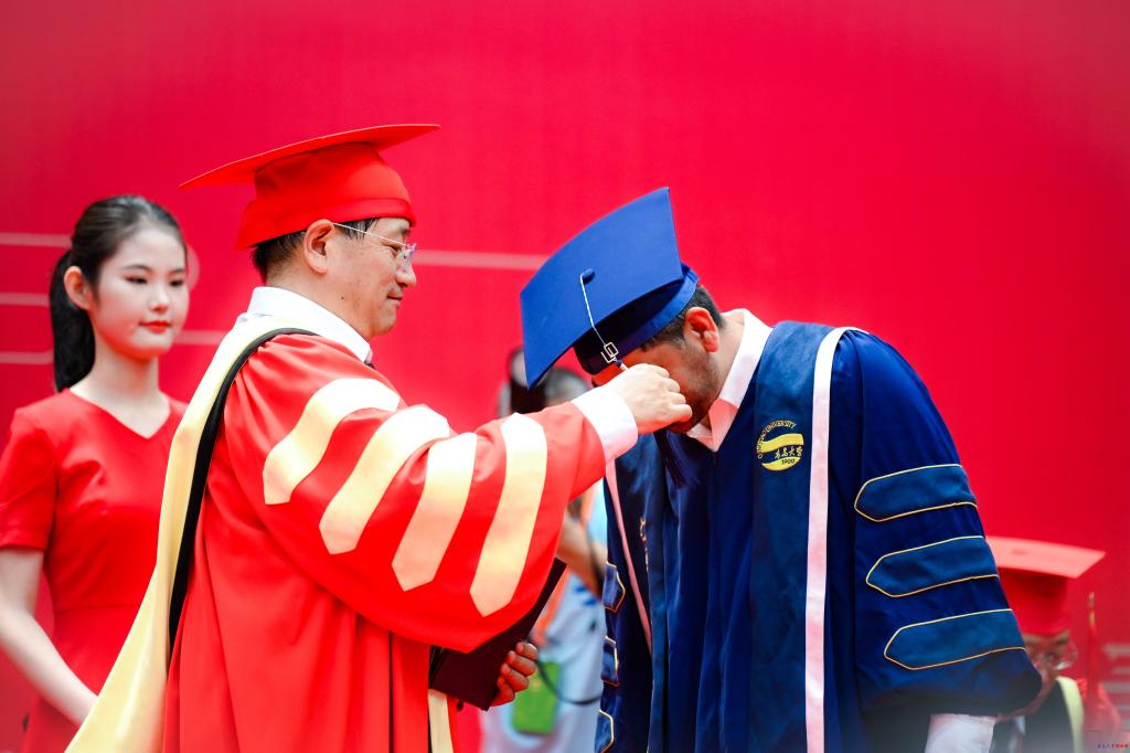 李建波主持学位授予仪式。胡金焱、魏志强为博士学位获得者一一颁发学位证书、扶正流苏并合影留念。校领导、各学院(部)院(部)长、相关职能部门负责人以及知名教授代表为硕士、学士学位获得者颁发学位证书、扶正流苏并一一合影留念。