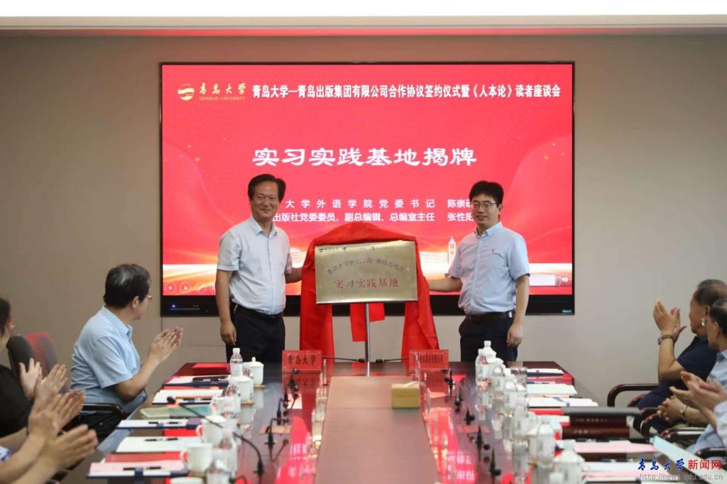 外语学院党委书记陈崇研与张性阳共同为“beat365在线唯一官网外语学院—青岛出版集团有限公司实习实践基地”揭牌。