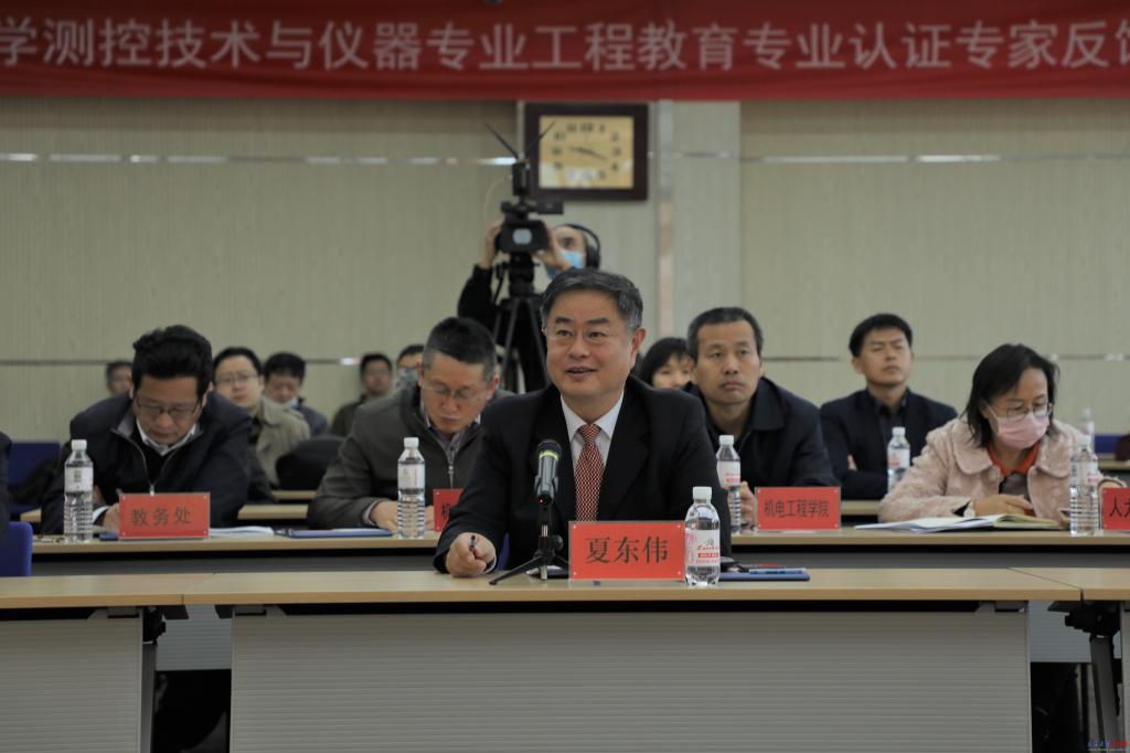 校长夏东伟代表学校对专家组的考查指导表示热烈欢迎和衷心感谢。他简要介绍了学校的办学情况和一流本科建设推进举措。夏东伟指出,本次专业认证既是对测控技术与仪器专业办学成果的检阅,也是促进专业水平提升的重要机遇,更是对学校整体办学水平的一次重要检验。他表示,学校一定全力以赴,积极配合专家组工作,以严肃认真的态度对待认证、以科学务实的工作接受考察。测控技术与仪器专业和其他准备申请认证的专业要根据专家的精准把脉和权威指导,找准自己的短板,找到努力的方向,有的放矢地持续改进,每位教师要自觉将“学生中心、产出导向、持续改进”的理念应用于教学活动中,实现教育教学质量的快速提升。