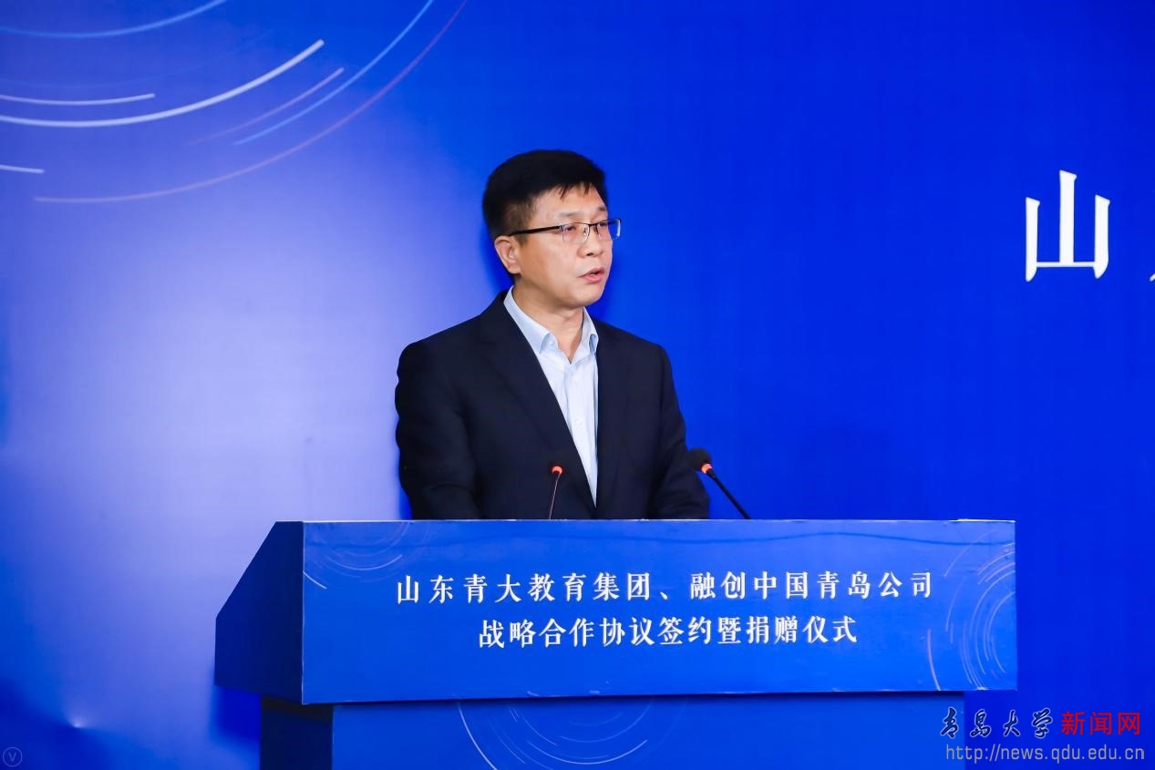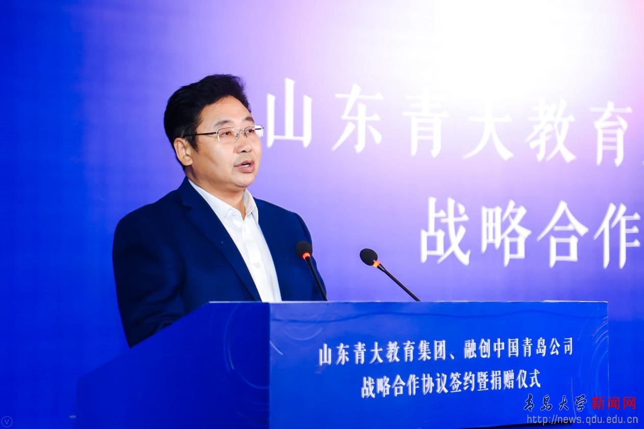 仪式上,于红波代表学校致辞。他表示,融创中国自2016年布局青岛,对青岛的城市建设和人文特色有着深刻的理解。此次双方战略合作协议的签署,标志着实质性合作迈出坚实的步伐。将进一步促进beat365在线唯一官网学科、人才优势与融创中国青岛公司的产业、资源优势的有机结合。最后他对融创中国青岛公司的慷慨捐赠表示了衷心的感谢,希望双方精诚合作,统筹推进在西海岸和胶州市基础教育的布局,充分发挥名校的辐射带动作用,助力西海岸和胶州优质教育均衡发展。