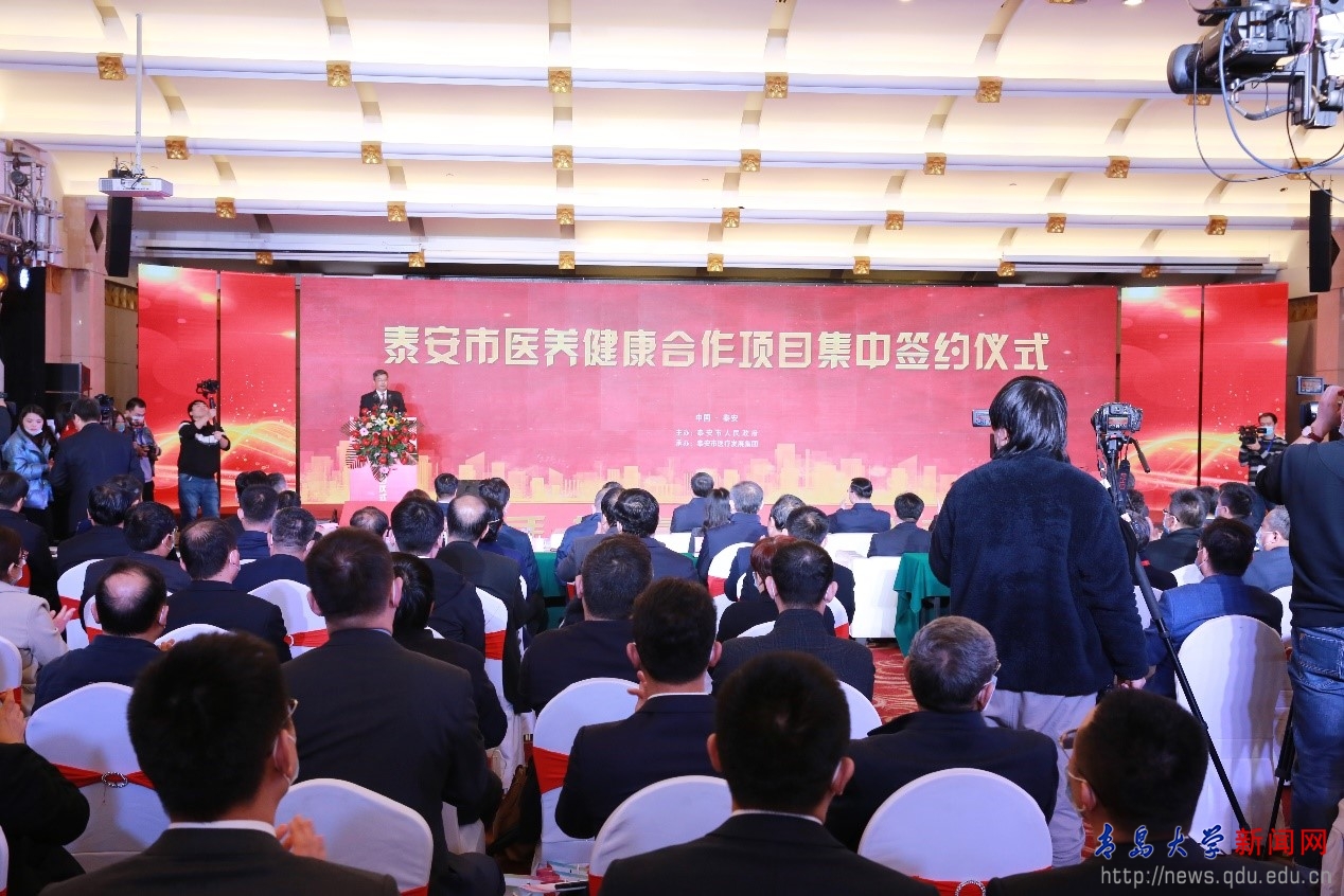 于永明在仪式上致辞。他代表学校祝贺协议的签署并感谢一直以来关心支持学校和医学事业发展的泰安市委市政府以及各界人士。于永明表示,此次签署战略合作协议,开启了与泰安市校地合作的新篇章,是双方紧密对接国家和区域医学中心建设目标,推进全链式医学中心建设,促进大医学产业成果转化,带动区域医学发展、医学原始创新和医疗服务能力的重要举措。通过“医科+医院”的共建模式,真正实现优势互补、共建共享、互利共赢,将助力推进泰安市全国城市医联体建设和“健康共同体”全国示范区创建,全面提升服务泰安市医药卫生与健康水平,为广大人民群众的健康福祉,为国家卫生健康事业发展作出更大的贡献。