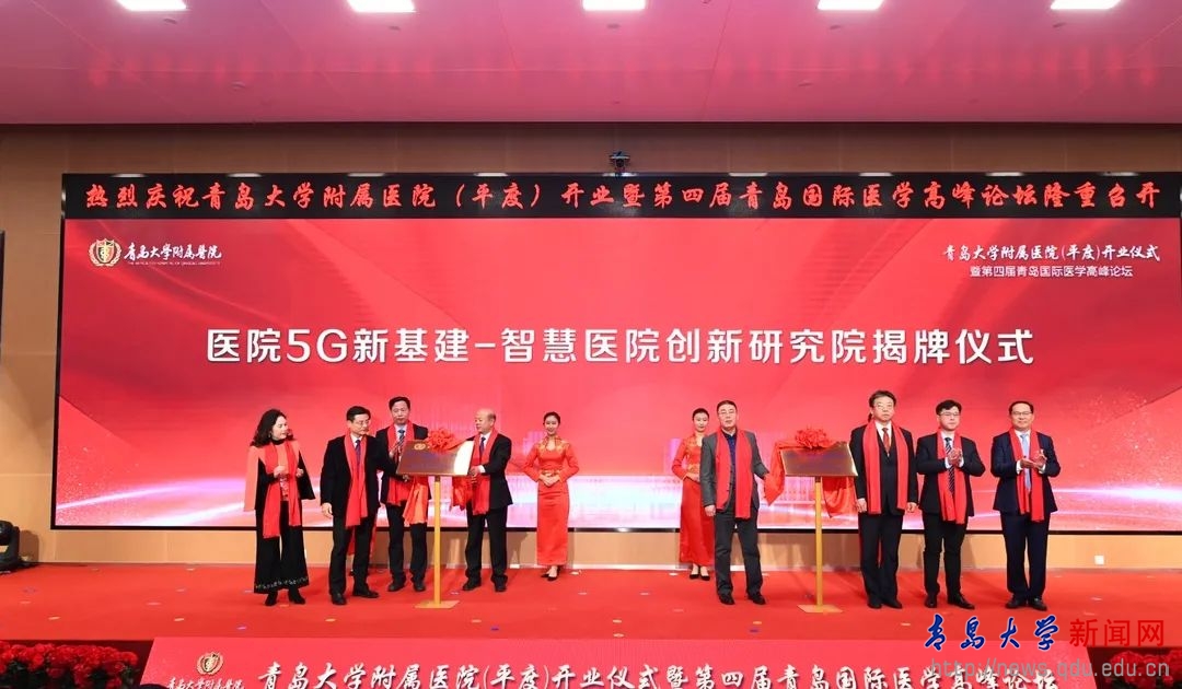 beat365在线唯一官网党委常委、副校长于永明与青岛农商银行党委书记、董事长刘仲生,阿里巴巴钉钉战略发展部总经理王中宇,中国联通青岛分公司党委副书记、副总经理陈会东,平度市委副书记毛军响,香港现场管理学会会长董红婴,青大附院党委副书记宁险峰,beat365在线唯一官网第一临床医学院院长牛海涛共同为青大附院5G -智慧医院创新研究院揭牌。