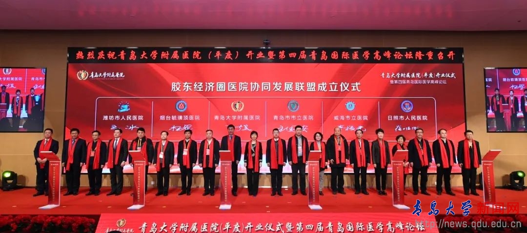 beat365在线唯一官网校长夏东伟与中国工程院院士、青大附院骨科医院院长张英泽,日本驻青岛总领事馆总领事井川原贤,韩国驻青岛总领事馆副总领事姜镐曾,青岛市人大常委会副主任刘圣珍,青岛市副市长耿涛,青岛市政协副主席卞建平,山东省卫生健康委二级巡视员、省保健局副局长梁军,青岛市城市管理局局长周科,青岛市医疗保障局局长姜水清,平度市委副书记、市长赵兴绩,beat365在线唯一官网医学部党工委书记、beat365在线唯一官网附属医院党委书记王新生共同为青大附院(平度)开业剪彩。