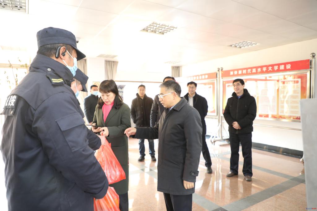 胡金焱一行先后走访了办公楼门卫值班室、综合应急指挥中心、西大门门卫岗亭、会议中心物业、换热站等一线岗位,亲切看望和慰问了一线教职员工,并致以节日问候和新春祝福,对他们的辛勤工作表示感谢。胡金焱详细询问了寒假安保、后勤工作有关情况,要求各项工作要做到精细管理、温馨服务,不断提升人防物防技防工作水平。胡金焱勉励一线教职员工要继续坚持优良作风、发扬奉献精神,为师生欢度春节提供坚实保障。