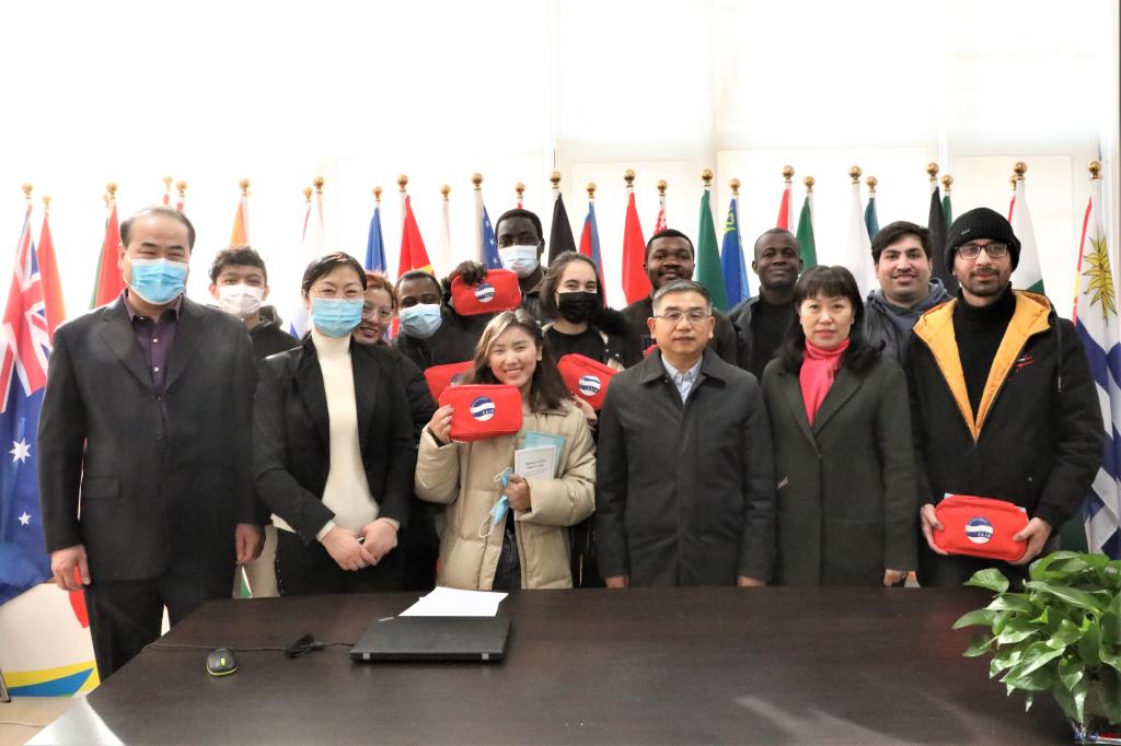 随后,胡金焱一行前往国际教育学院看望慰问了在校留学生,为留学生们送去了新春祝福和问候,并现场发放了防疫健康包和疫情防控手册。胡金焱详细询问了留学生的生活和学习情况,他鼓励留学生切身感受和体验中国传统文化,度过一个平安祥和的中国年。胡金焱还与远在海外的留学生以及中国研究生海外志愿者视频连线,向在异国的青大学子们致以新春祝福和诚挚慰问,线上师生代表向胡书记介绍了自己的学习和生活情况,座谈现场气氛十分融洽。胡金焱书记一行还走访慰问了春节期间坚守工作岗位的国际教育学院值班人员。