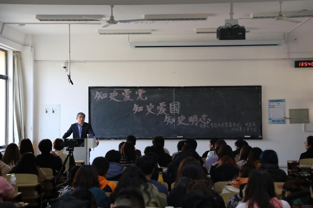 3月5日下午,校党委书记胡金焱在浮山校区博学楼204教室以“知史爱党、知史爱国、知史明志”为题,为新闻与传播学院2020级100余名本科生讲授思政课。