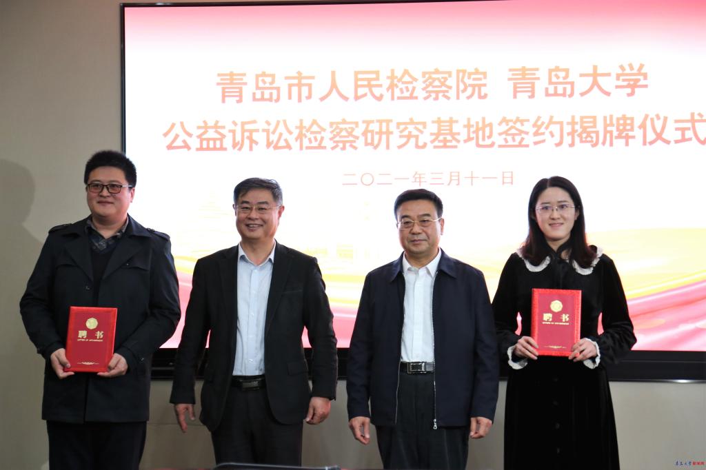 揭牌仪式上,李建新和夏东伟分别向互聘研究员发放聘书。来自青岛两级检察院的2名公益诉讼检察官及beat365在线唯一官网法学院和环境科学与工程学院的2名专家分别被聘为公益诉讼检察研究基地研究员。
