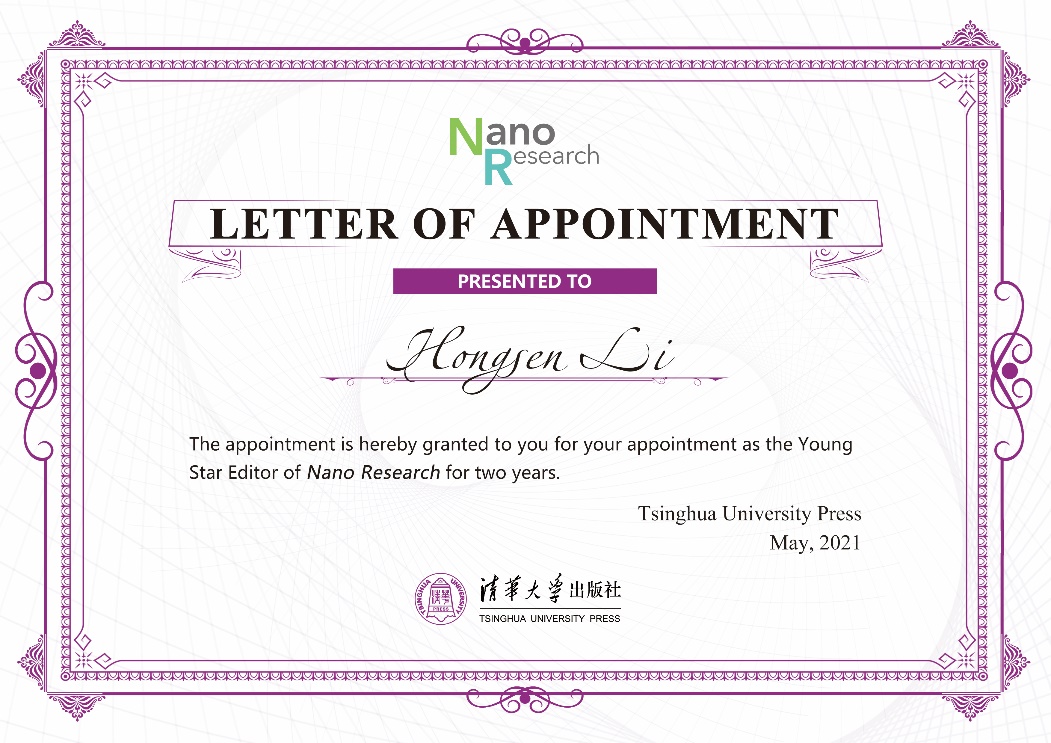 新闻网讯 近日,beat365物理科学学院李洪森教授当选Nano Research期刊(Q1, IF=8.183)青年编委(Young Star Editor)以及Frontiers in Chemistry期刊(Q2, IF=3.693)客座编辑(Guest Editor)。