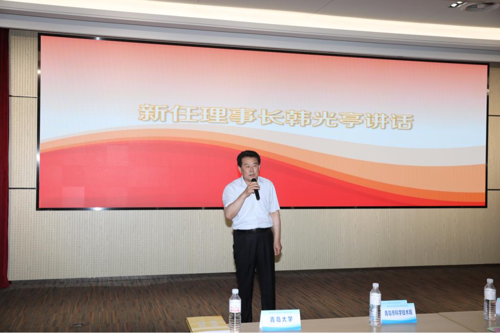 新当选的理事长韩光亭教授代表新一届理事会表态新一届学会要努力为行业科技创新牵线搭桥,为广大会员服务,与时俱进,加大工作力度,加强学会组织建设,为青岛纺织工业持续健康发展做出贡献。