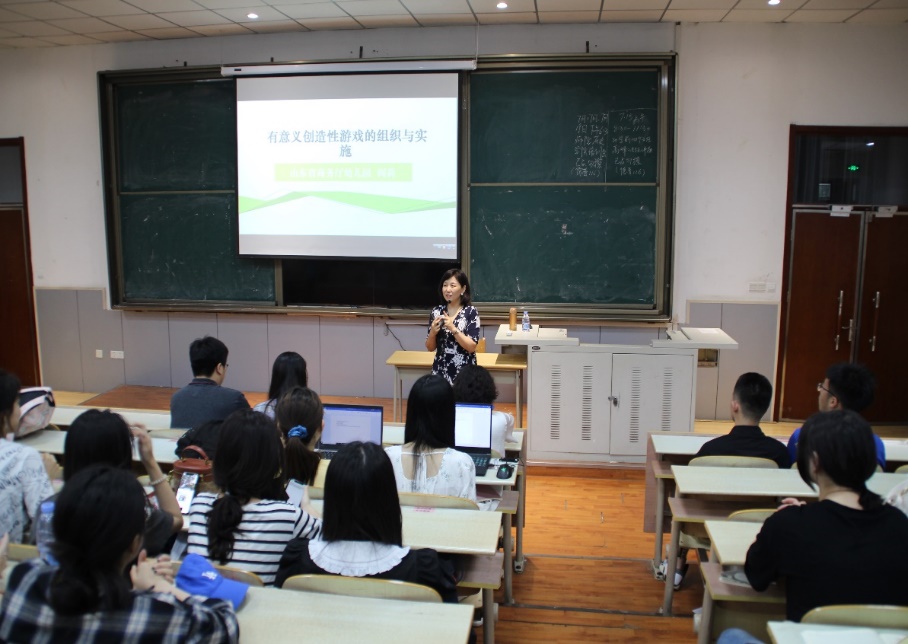 阎莉就“有意义”和“创造性游戏”的概念界定进行了详细说明。从《指南》和《纲要》出发,结合幼儿园的案例,介绍幼儿园“有意义游戏”、“创造性游戏”的含义与内容,并向到场学生们就容易困惑的问题作出了详细解答和区分,最后将有意义创造性游戏组织和实施总结为三个层面:第一,倡导游戏精神,把握游戏的真谛;第二,相信儿童都是游戏专家,重新认识游戏中的儿童;第三,静心慢行,追随儿童,重新塑造游戏中的教师。