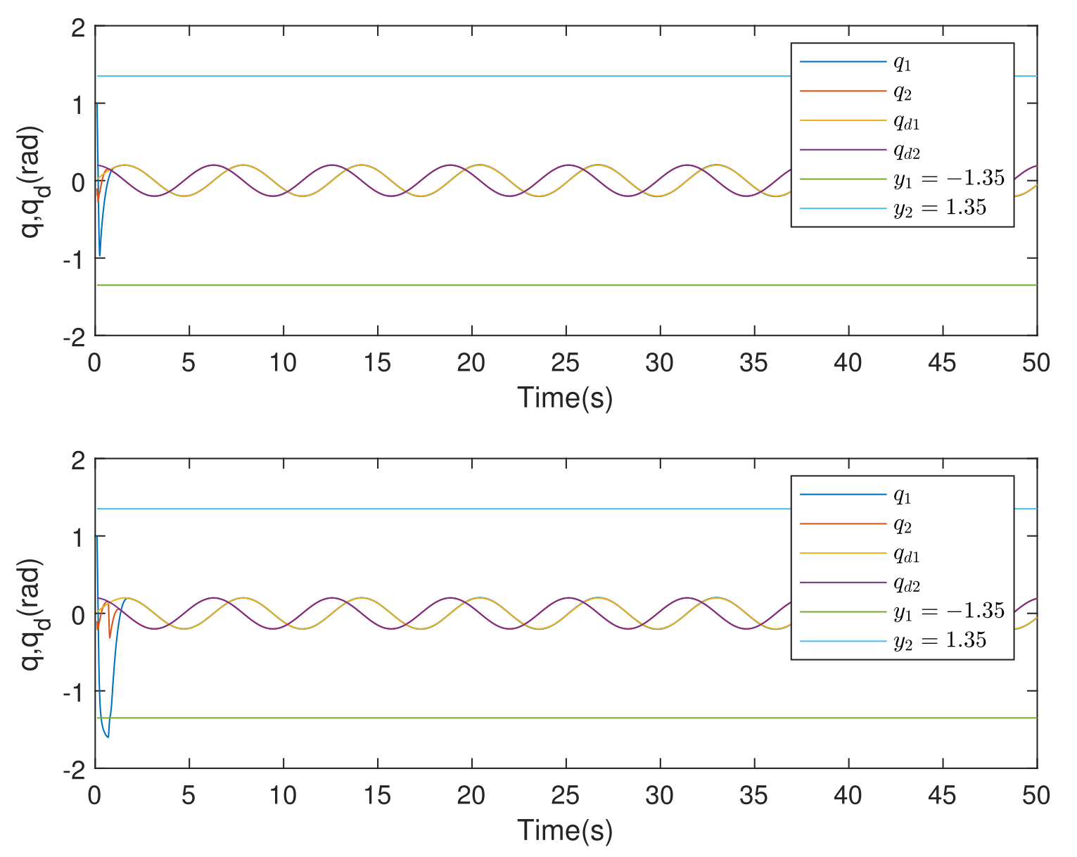 论文针对带有输出受限机器人系统提出了一种新的有限时间自适应事件触发控制方法,将命令滤波反步控制与事件触发控制相结合,既保留了命令滤波反步控制的计算简便、瞬态性能好等优点,同时又通过事件触发降低了通信与资源损耗,使关节位置跟踪误差在有限时间内收敛到期望的领域。为了验证算法的优越性,论文以一个二连杆机械臂模型进行验证,通过与不考虑输出受限的控制方法和仅满足指数收敛的反步方法做仿真对比发现,论文所提出的方法有着更好的收敛和稳态性能。