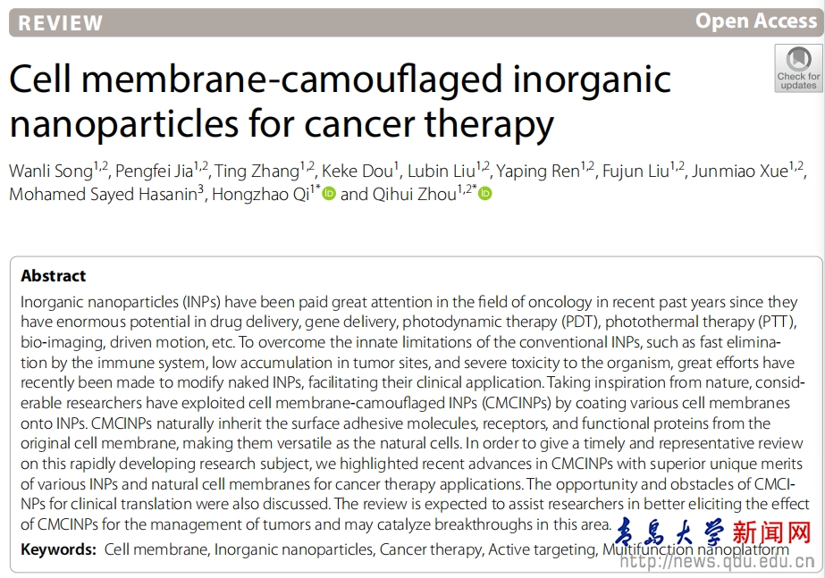 新闻网讯 近日,口腔医学院/转化医学研究院联合培养2019级本科生宋万里作为第一作者在期刊Journal of nanobiotechnology(IF2020: 10.435,中科院大类一区,Top期刊)发表综述论文“Cell membrane-camouflaged inorganic nanoparticles for cancer therapy”,指导老师和论文通讯作者为周祺惠特聘教授和亓洪昭助理教授,beat365在线唯一官网为第一单位和通讯单位。