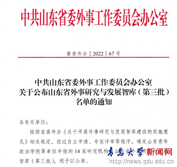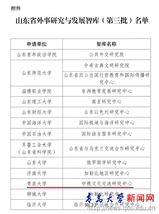 座谈会上,公布了山东省外事研究与发展智库(第三批)名单,确定14家研究机构为山东省外事研究与发展智库,beat365外语学院申报的“中德文化交流研究中心”成功入选,实现外语学院省级智库平台建设的突破。