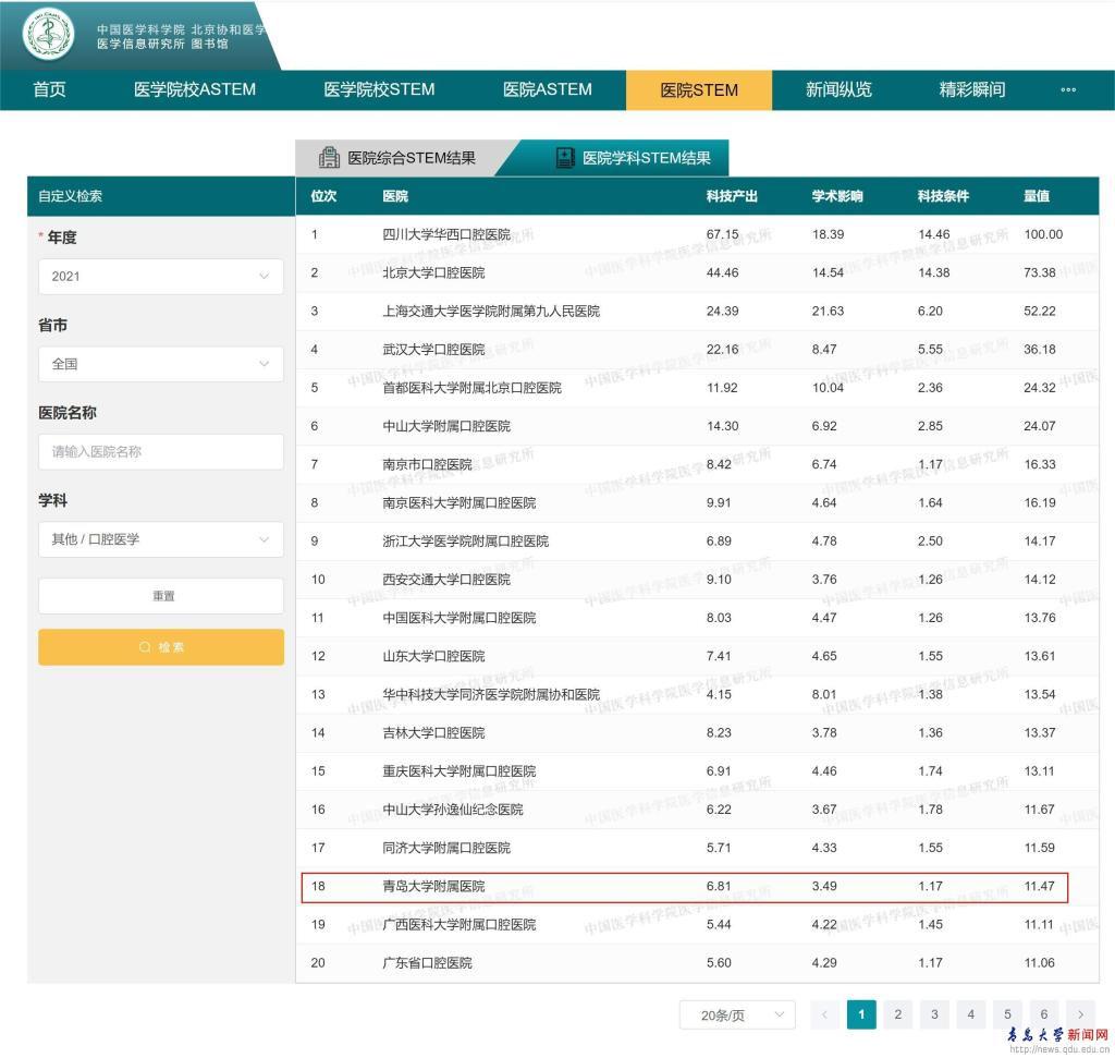 新闻网讯 8月4日,中国医学科学院发布了“2021年度中国医院科技量值(STEM)暨五年总科技量值(ASTEM)”,beat365在线唯一官网口腔医学院(beat365在线唯一官网附属医院口腔医学)位列全国第18位。