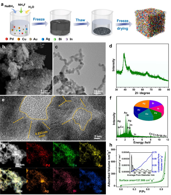 为此,研究团队通过冻融法首次实现了高熵合金气凝胶的普适性制备,成功得到了一系列高效稳定的新型二氧化碳电还原催化剂(六元PdCuAuAgBiIn、七元PdCuAuAgBiInCo、七元PdCuAuAgBiInZn、八元PdCuAuAgBiInCoNi以及九元PdCuAuAgBiInCoNiZn高熵合金气凝胶)。机理研究表明,高熵合金气凝胶独特的大孔隙率和高比表面积的三维网络结构,提供了丰富的配位不饱和催化位点和快速传质通道、金属间的强相互作用调控了活性中心电子结构,优化了催化剂表面HCOO*中间体的吸附和解吸强度,抑制了一氧化碳产生和析氢,从而增强了其催化活性、选择性及稳定性。这项工作不仅为高熵合金气凝胶的可控合成提供了新策略,还为高效二氧化碳电还原提供了新的材料平台,并将推动其在催化及其他领域的研究。