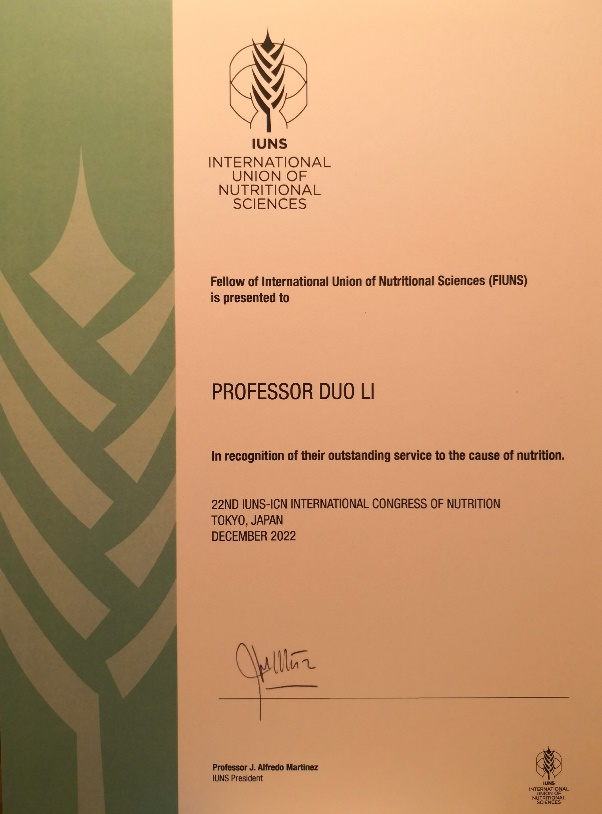 IUNS于1946年在英国成立,由来自100多个国家的营养学学术团体组成,是营养科学领域最权威的国际性学术组织。IUNS设立的Fellow(院士/会士)称号为营养科学技术方面的最高学术称号,用于表彰在营养科学领域取得杰出科研成就、并为学科发展做出卓越贡献的科学家。按照IUNS的规定,国际营养科学联合会的院士/会士申报不接受个人申请,仅接受会员国学术组织、IUNS院士或前任主席推荐,评审工作由独立的提名委员会(nomination committee)完成,最终候选人在会员国和成员单位的代表大会上通过并确定。