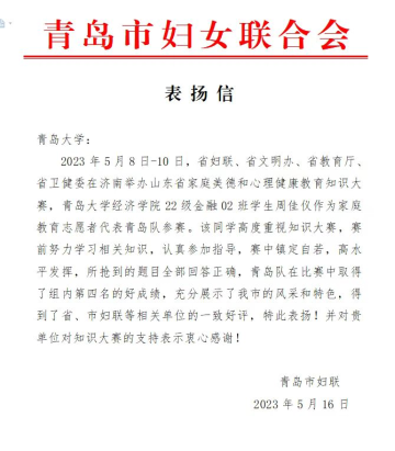 新闻网讯 近日,省妇联、省文明办、省教育厅、省卫健委在济南举办山东省家庭美德和心理健康教育知识大赛,beat365经济学院2022级金融02班学生周佳仪作为家庭教育志愿者代表青岛队参赛,最终在比赛中取得了组内第四名的好成绩。