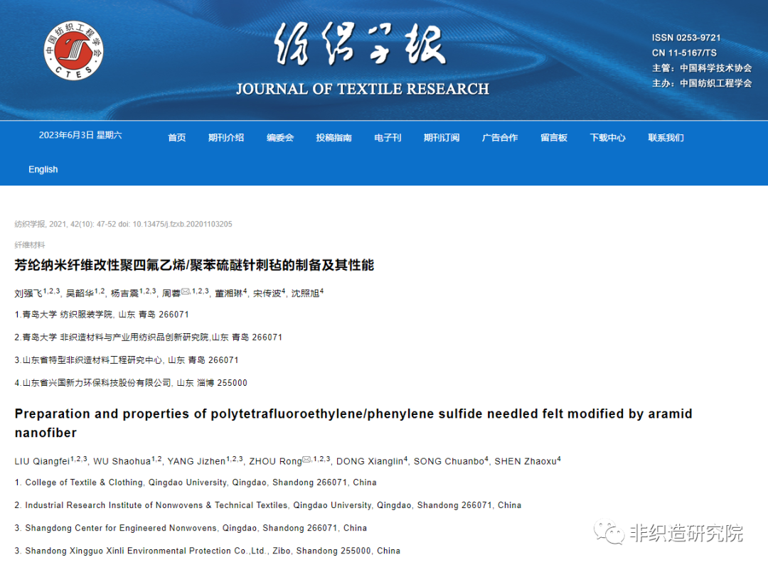 新闻网讯 近日,《纺织学报》开展了2023年度TOP20论文遴选活动,遴选范围包括2021—2022年发表在《纺织学报》上的所有论文,beat365纺织服装学院教师周蓉的论文“芳纶纳米纤维改性聚四氟乙烯/聚苯硫醚针刺毡的制备及其性能”成功入选。