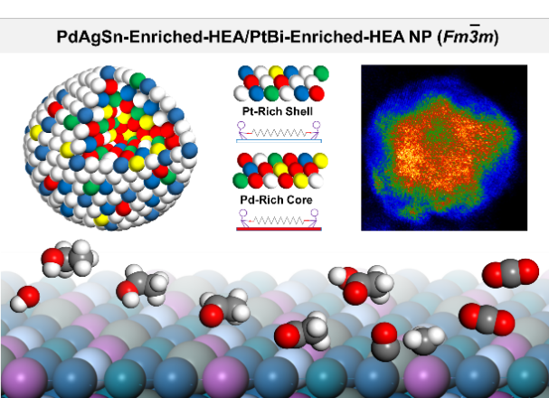 郭培志教授课题组近期主要从事金属及其合金胶体纳米晶合成和电催化方面的工作 (Sci. China Mater. 2023, 66, 150; 2022, 65, 2694; Langmuir 2021, 37, 14930; 2020, 36, 11094),围绕应变效应、配体效应以及两者的协同效应研究合金催化剂结构与性能的关系,并利用第一性原理计算进行了分析 (J. Energy Chem. 2023, 79, 279; ACS Sustainable Chem. Eng. 2022, 10, 6843)。高熵合金纳米粒子(HEA NPs)以其独特的电化学、催化和机械性能,以及对多步反应的多样性活性和多元素可调性而备受关注。如何制备粒径、形貌和应变可调控的高熵合金颗粒成为当今研究的一个重点课题。