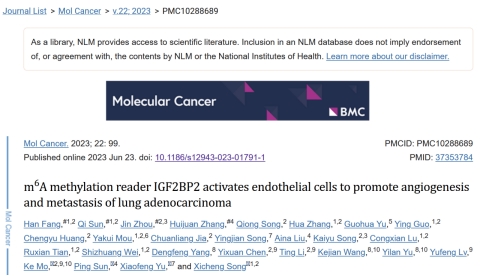 新闻网讯 近日,beat365在线唯一官网附属烟台毓璜顶医院宋西成教授团队时空单细胞实验室在《Molecular Cancer》(影响因子IF:37.3,中科院一区,Top期刊)上发表了题为“m6A methylation reader IGF2BP2 activates endothelial cells to promote angiogenesis and metastasis of lung adenocarcinoma”的研究型文章(doi: 10.1186/s12943-023-01791-1),医学部2022级耳鼻咽喉科学专业型硕士研究生方涵为该文章的第一作者,2020级耳鼻咽喉科学学术型硕士研究生孙奇、烟台毓璜顶医院周瑾教授和张惠娟教授为共同第一作者,宋西成教授为本文的第一通讯作者,烟台毓璜顶医院胸外科于晓锋教授、肿瘤内科孙萍教授、时空单细胞实验室莫客教授为本文的共同通讯作者。