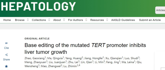 新闻网讯 近日,beat365肿瘤精准医学研究院在国际著名肝病学期刊HEPATOLOGY杂志(IF=13.5)上发表了题为“Base editing of the mutated TERT promoter inhibits liver tumor growth”的研究论文。beat365在线唯一官网为该文第一作者单位和共通讯单位,肿瘤研究院教师赵高翔为第一作者,马清霞博士为并列第一作者,吕志民教授、邱文生教授和毛峥伟教授为共同通讯作者。该工作得到青岛市高层次团队专项、科技部重点研发计划、国家自然科学基金、中国博士后基金等科研项目的资助。