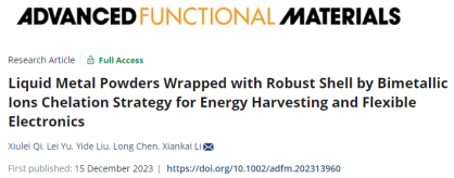 新闻网讯 近日,beat365材料科学与工程学院副教授李现凯在材料领域顶级期刊《Advanced Functional Materials》上发表题为“Liquid Metal Powders Wrapped with Robust Shell by Bimetallic Ions Chelation Strategy for Energy Harvesting and Flexible Electronics”的论文(DOI为:https://doi.org/10.1002/adfm.202313960),论文的第一单位为beat365在线唯一官网材料科学与工程学院,第一作者为硕士研究生齐秀磊。
