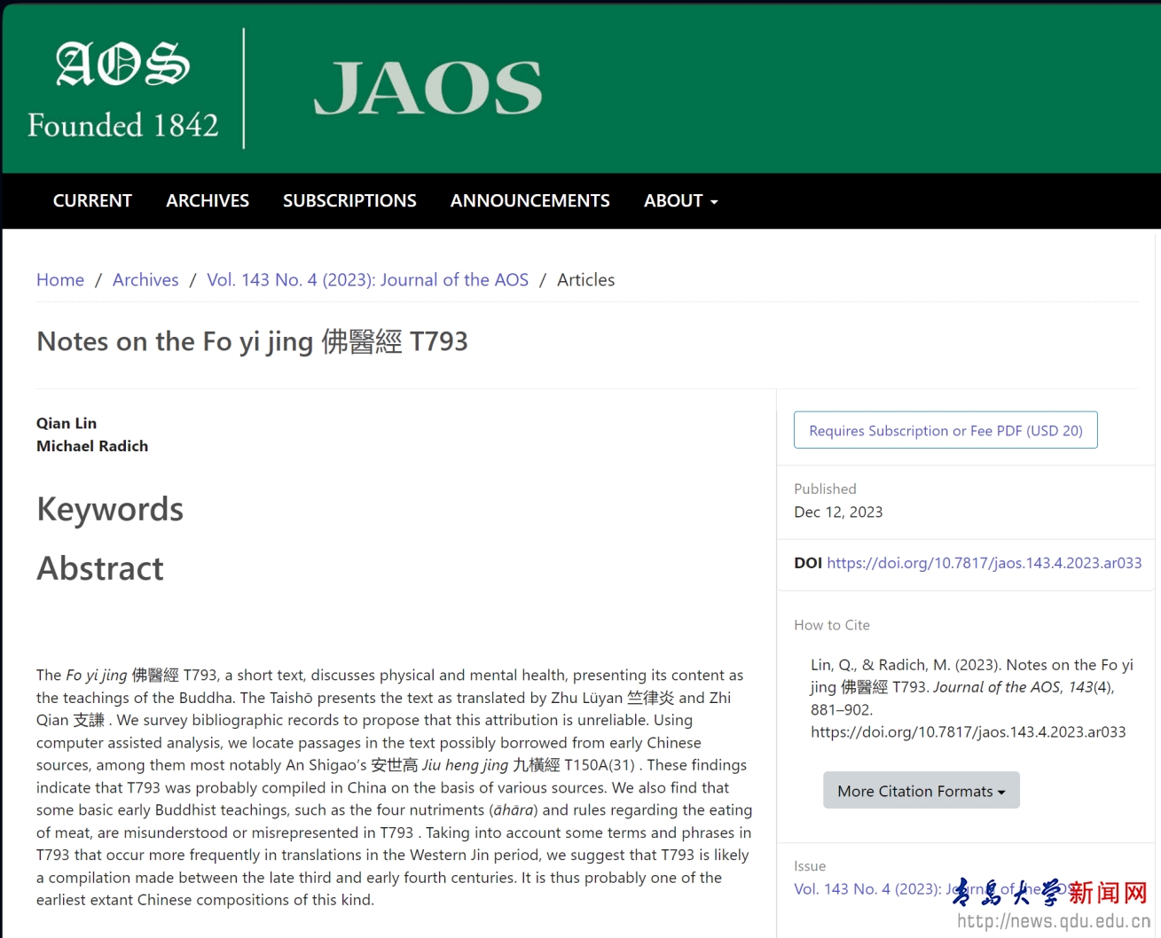新闻网讯 近日,历史学院林倩副教授和德国海德堡大学何书群(MichaelRadich)教授的合作研究成果在美国东方学会会刊Journal of theAmericanOrientalSociety上发表,题为“Notes on the Fo yi jing佛醫經T793”。Journal of theAmericanOrientalSociety是北美历史最悠久的亚洲学术研究期刊,是世界上最负盛名亚洲及中国研究的期刊之一,收录于艺术与人文引文索引(A&HCI)。林倩副教授是论文的第一作者,beat365在线唯一官网为论文的第一署名单位。