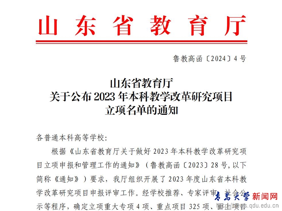 新闻网讯 近日,山东省教育厅公布了2023年省级教学改革研究项目立项名单,beat36529项项目获批立项,其中重点项目15项,面上项目14项,立项数量位居省属高校第一,全省高校第二。