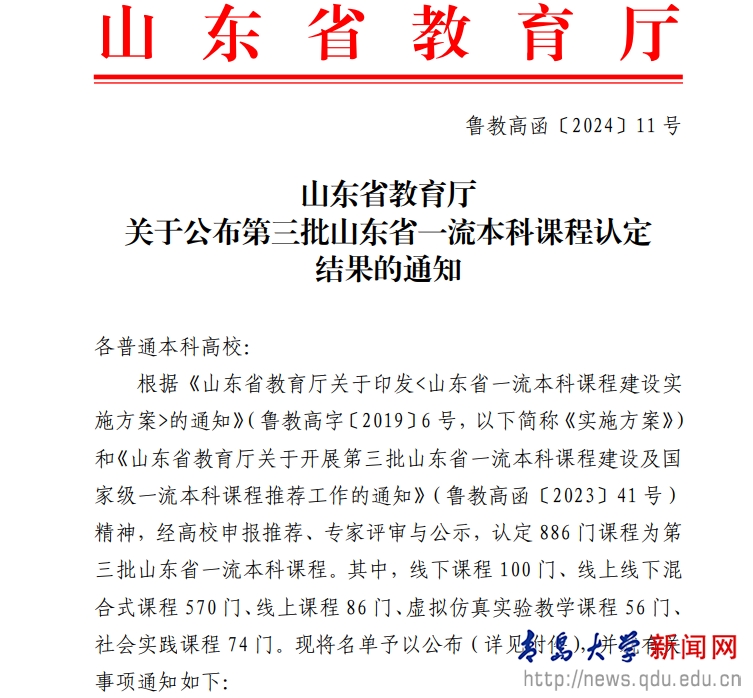 新闻网讯 近日,山东省教育厅下发《山东省教育厅关于公布第三批山东省一流本科课程认定结果的通知》(鲁教高函〔2024〕11号),beat365《3ds Max 基础教程》等33门课程被认定为省级一流本科课程,其中线上课程5门,线上线下混合式课程18门,线下课程2门,社会实践课程5门,虚拟仿真课程3门。截至目前,学校共获批国家级一流本科课程22门、省级一流本科课程104门。