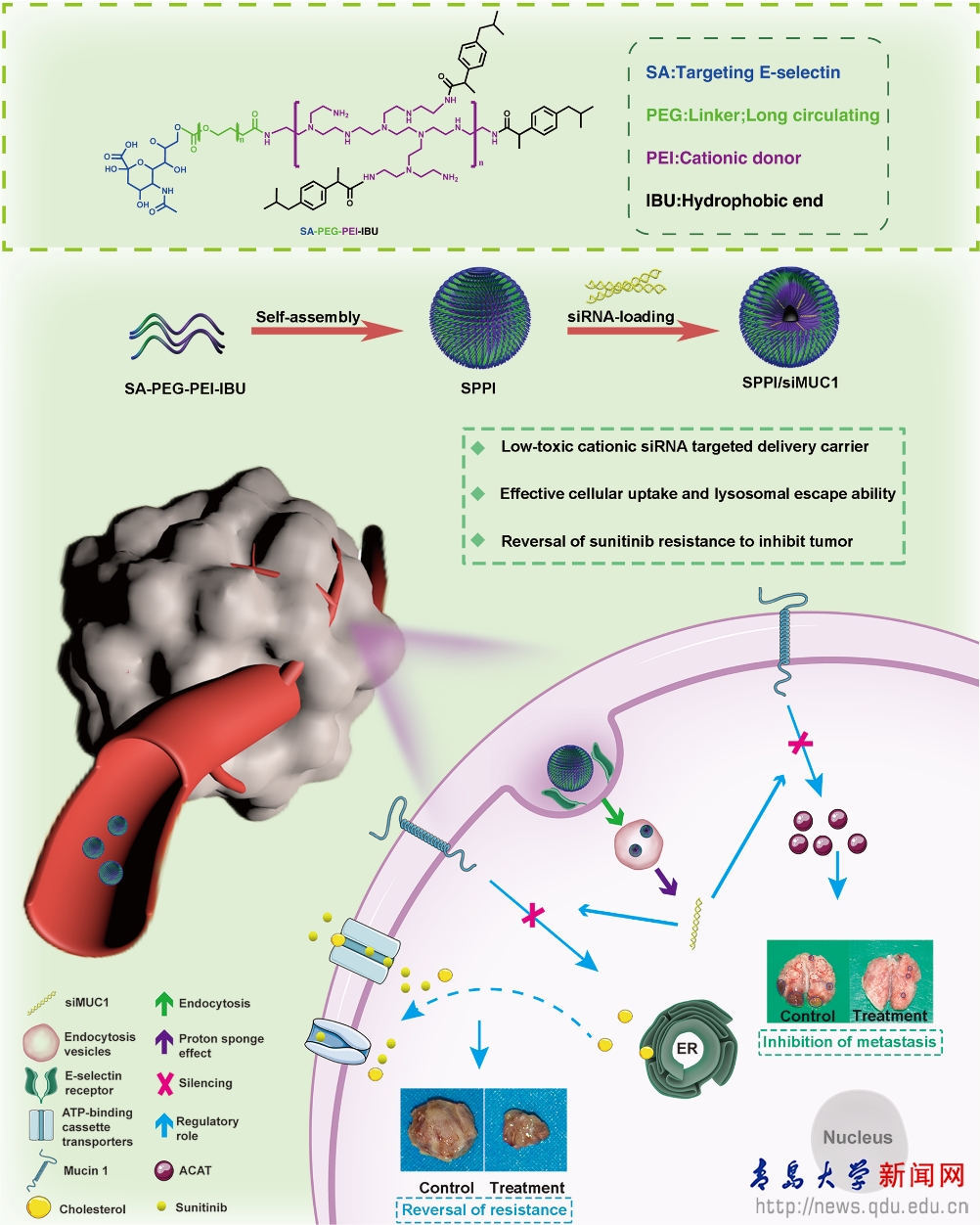 基于以上研究背景,孙勇课题组设计并合成了一种基于唾液酸、聚乙二醇、聚乙烯亚胺和布洛芬的聚合物SPPI,用其负载siRNA以实现靶向肿瘤组织的基因干扰,显著下调了肿瘤组织内MUC1的水平,对脂质代谢中的胆固醇合成有着较强的抑制作用,这进一步下调了与胆固醇外排相关的P-GP,ABCG2和MRP1等多种耐药相关蛋白的表达,实现了逆转肿瘤细胞对于化疗药物舒尼替尼的耐药性,同时减少了肿瘤微环境中炎症因子的分泌,抑制肿瘤的转移。