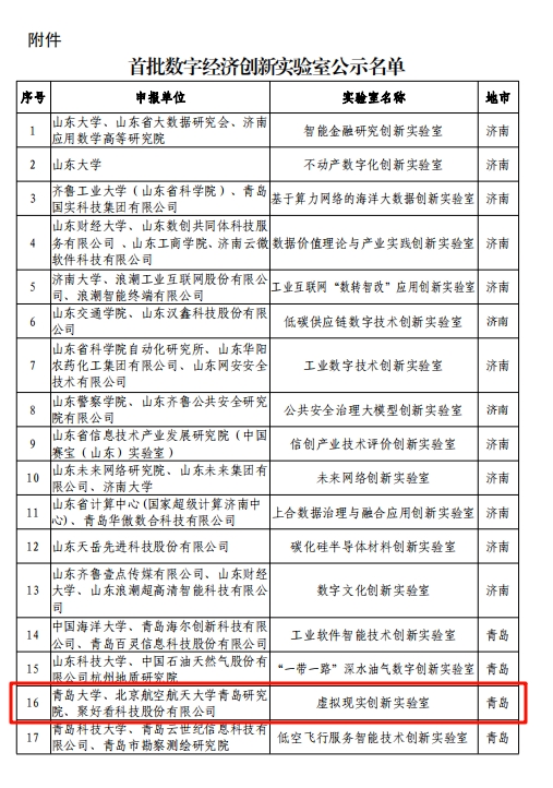 新闻网讯 日前,山东省工业和信息化厅网站发布了“关于首批山东省数字经济创新平台名单的公示”,由beat365牵头,联合北京航空航天大学青岛研究院、聚好看科技股份有限公司共同申报的“虚拟现实创新实验室”成功入选首批山东省数字经济实验室。